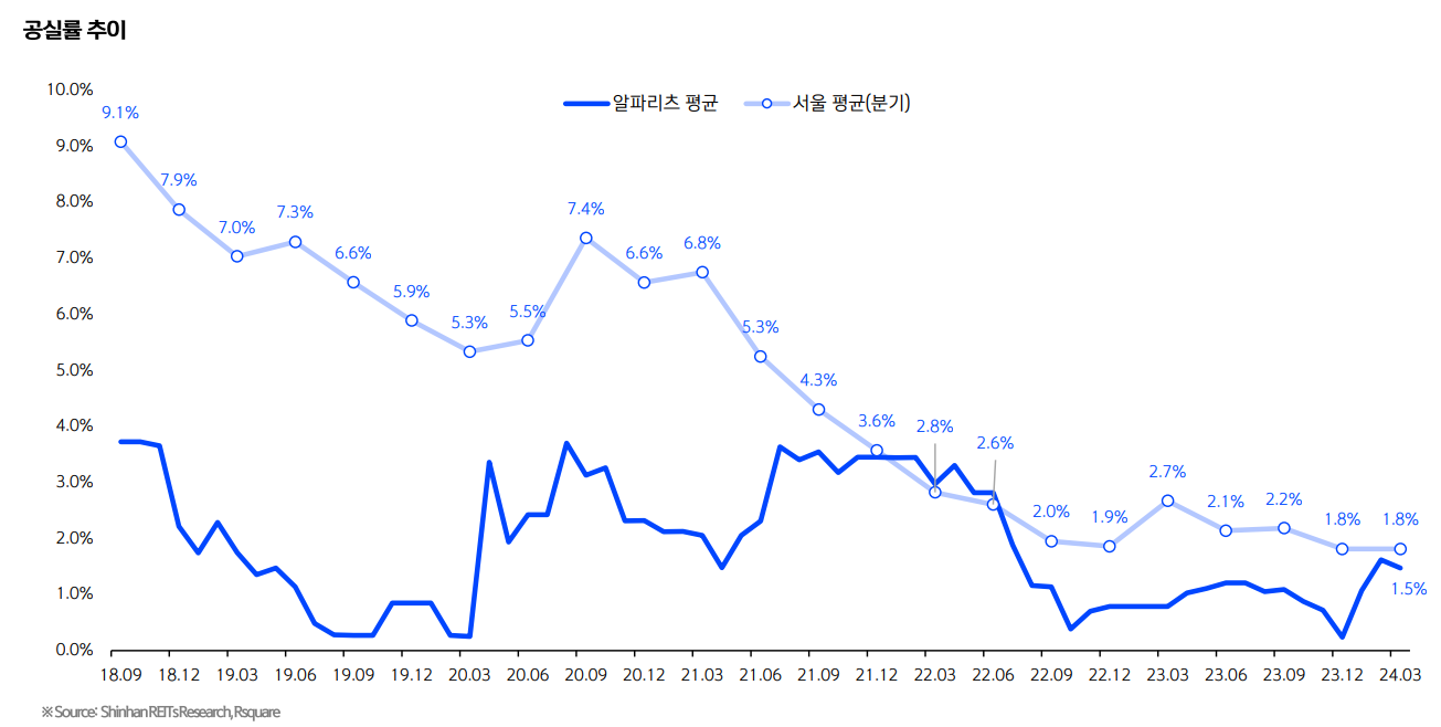 신한알파리츠는 공실률 추이를 봐도, 서울 평균보다 낮은 1.5%의 공실률을 기록하고 있는 중이다.