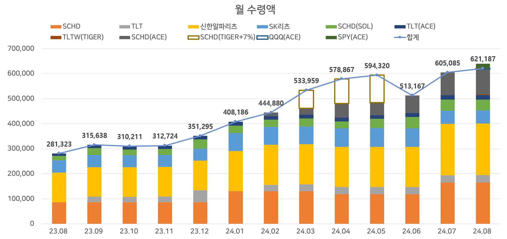 SCHD(ACE)가 이제 제법 많은 비중을 차지하고 있고, 잘 성장(?)하고 있다.