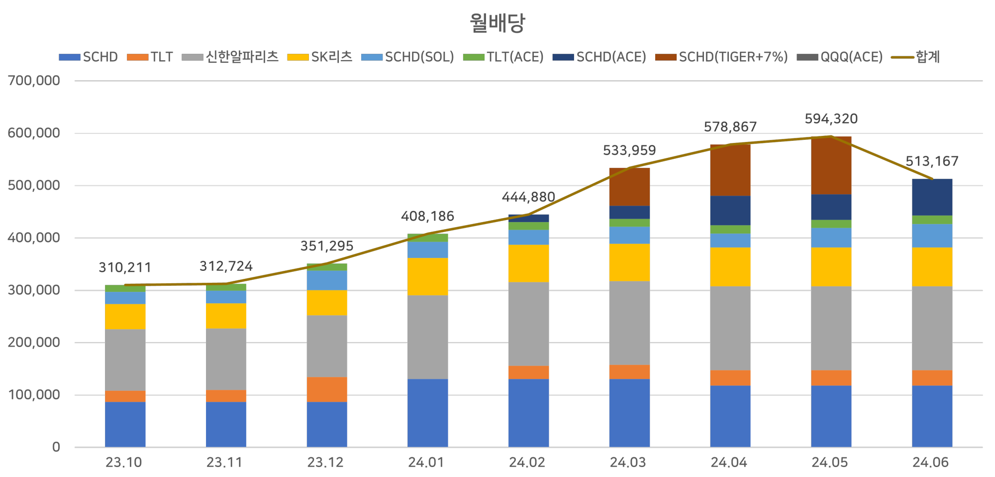 추정이라고 적은 이유는 7월 1일에 들어올 SCHD 배당금을 환율 1380원 기준으로 가져왔기 때문에…