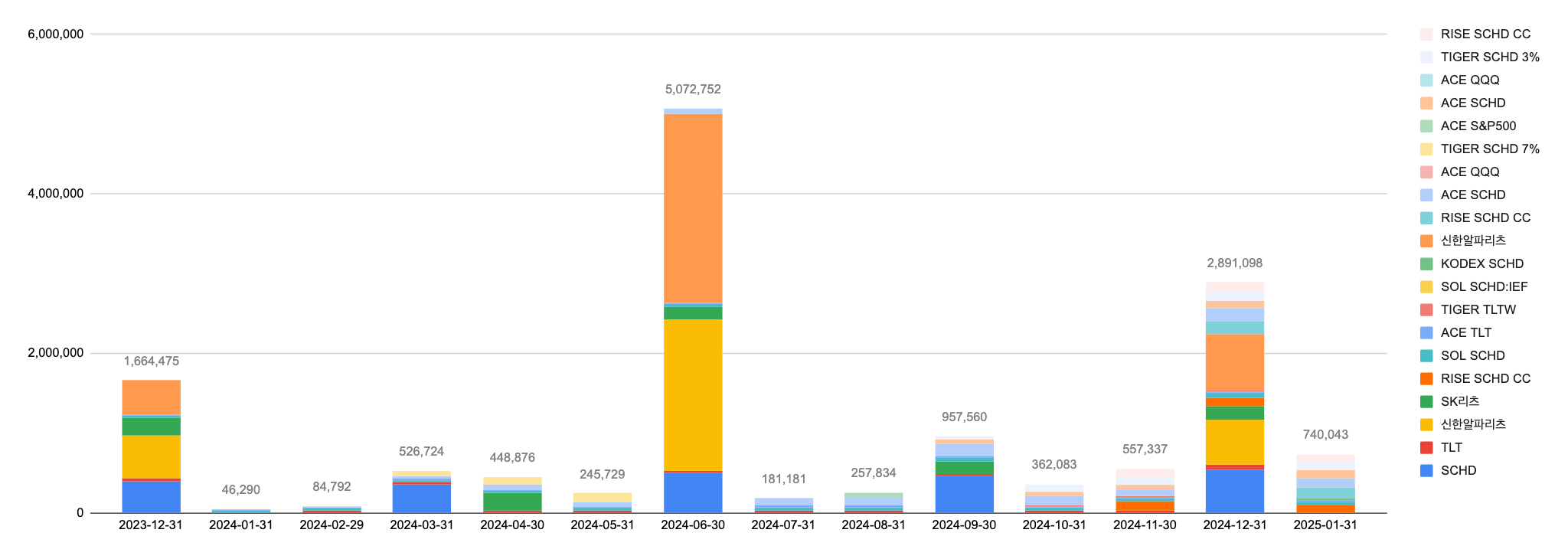 아내의 연금저축에는 올해 한도인 1,800만원을 넣고, ACE SCHD와 ACE QQQ를 한방에 매수했다. 이제 제법 규모가 커져서 매월 10만원 이상씩 분배금이 지급되고 있다. 12월의 분배금보다는 금액이 적긴 하지만, 뭐 만족한다.