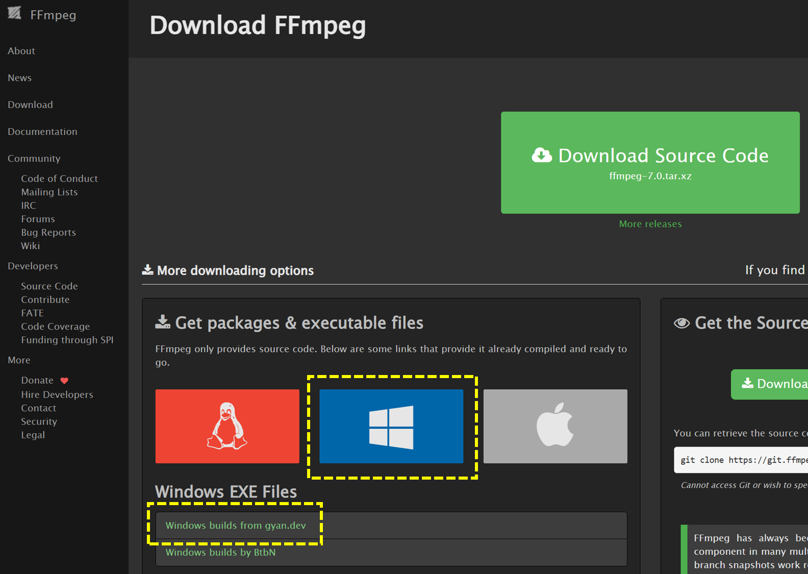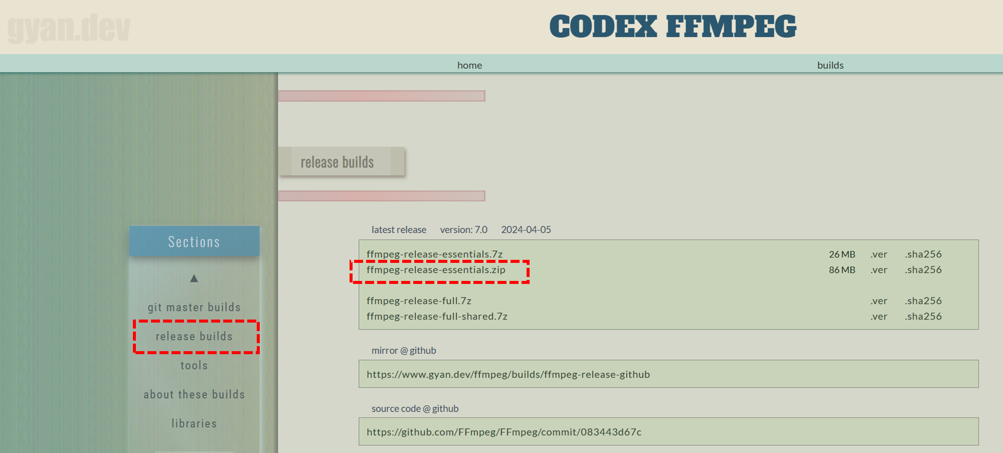 직접 사이트에 방문하여, ffmpeg 을 빌드한 파일을 통해 설치할 수 있습니다. 아래 링크의 사이트를 방문합니다.