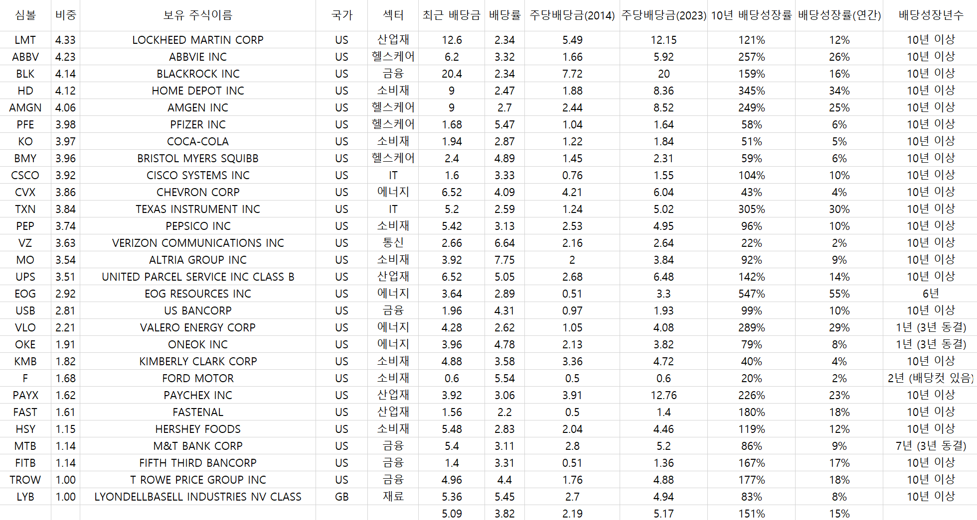 종목당 하나씩 적어보기 보다는 한 장의 표로 SCHD가 어떤 ETF인지 전체적인 그림을 확인하는데 충분하다.