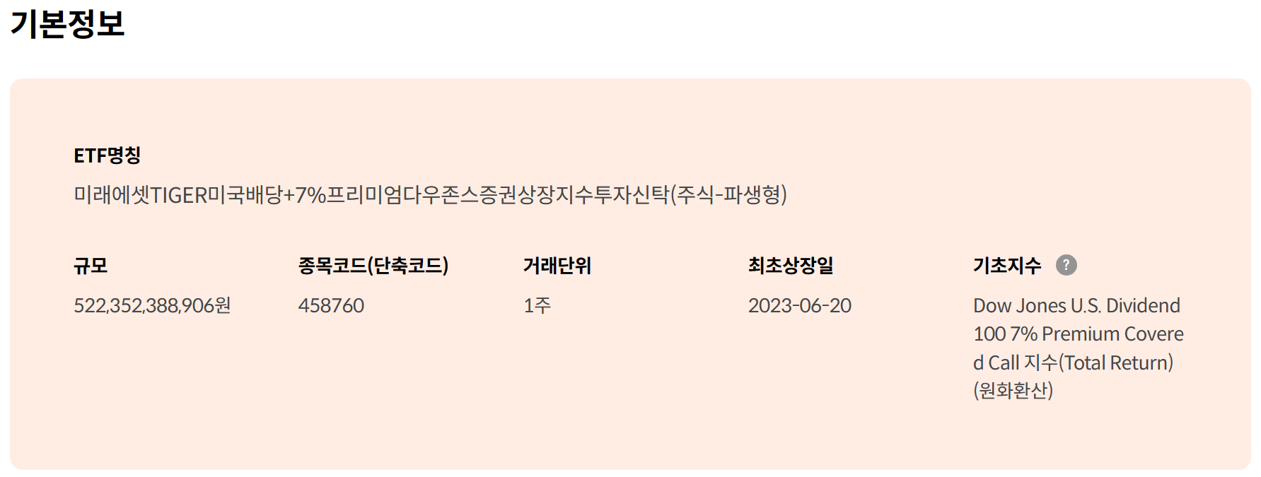 TIGER 미국배당+7%프리미엄다우존스 ETF 정보