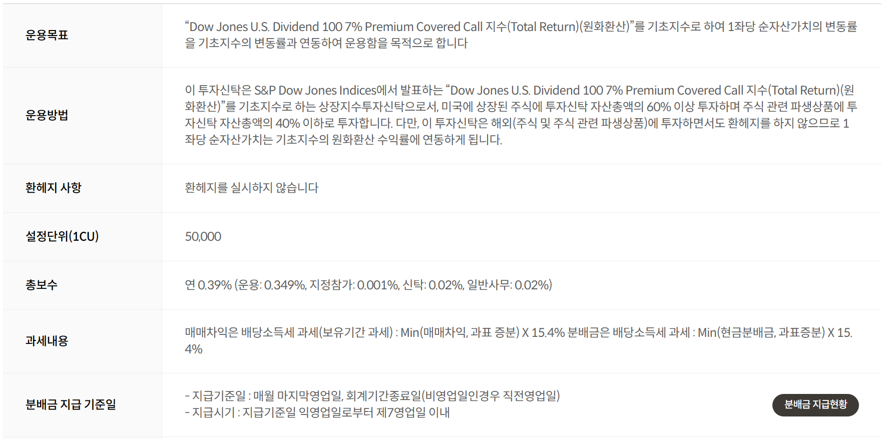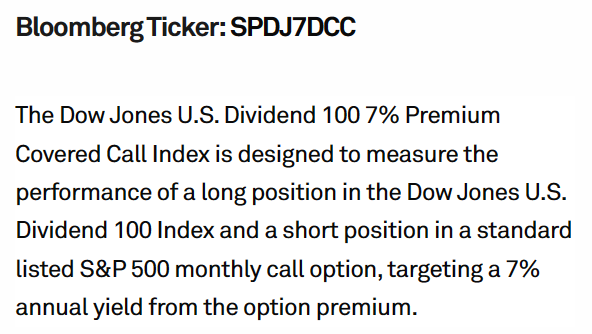 “다우존스 미국 배당 100 7% 프리미엄 커버드콜 지수는 다우존스 미국 배당 100 지수 매수 포지션과 표준 상장 S&P 500 월간 콜 옵션 매도 포지션의 성과를 측정하도록 설계되어 옵션 프리미엄에서 연간 7%의 수익률을 목표로 합니다.” 라고 설명되어 있다.
