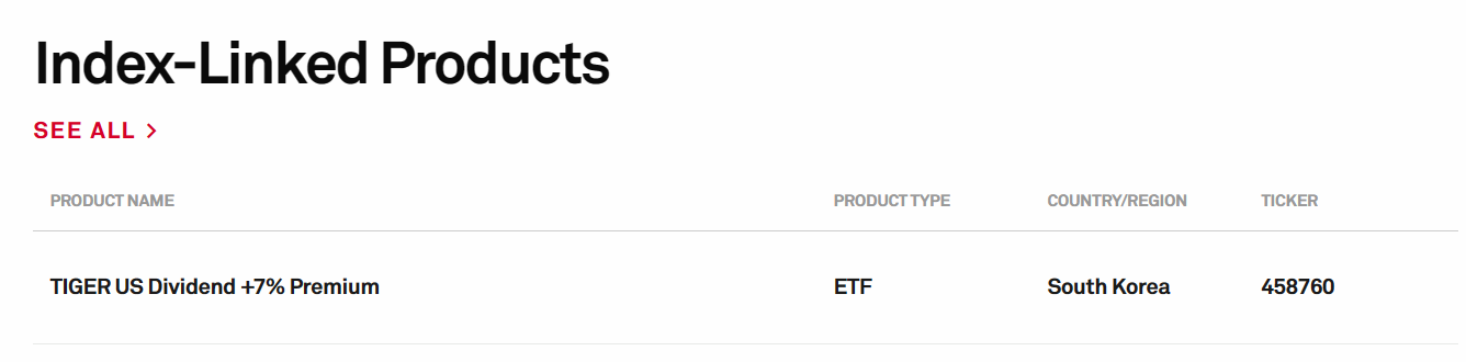 해당 지수를 사용하는 ETF는 “TIGER US Dividend +7% Premium” 이라고 되어 있다. SPG Global 에서 많은 기초지수를 개발하는데, 요즘 배당 관련된 기초지수가 한국에 상장된 ETF와 연결된 경우가 많이 보인다. TIGER도 그렇고 KODEX도 그렇고… 사이트 구경하다 보면 찾아볼 수 있다.