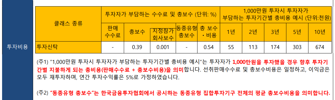 총 보수는 0.39%. 매매 및 기타 비용을 제외한 비용인데, 투자보고서에는 0.54%로 명시되어 있다. 생각보다 총 비용이 쎄다.